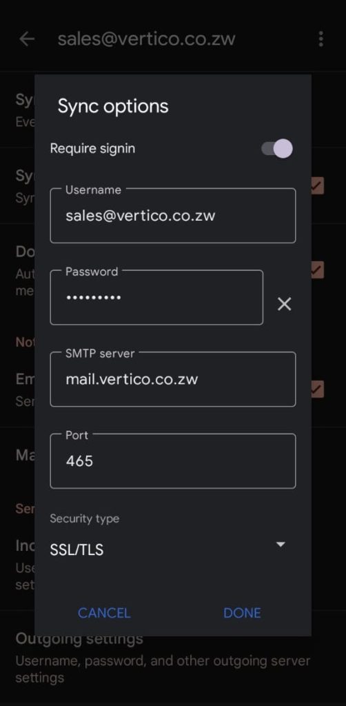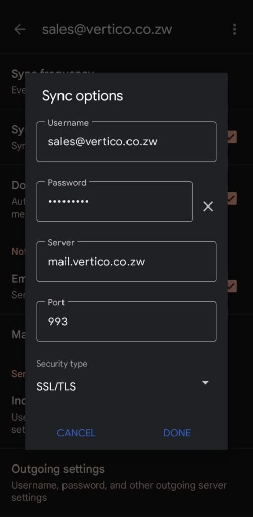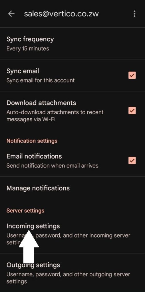 1. When facing challenges with receiving or sending emails via your Gmail App, first try to login to your email via webmail (check https://vertico.co.zw/docs/quick-email-access-via-webmail/ ). Test whether your emails are sending and if you are receiving emails from there. If yes, then move on to the next step.