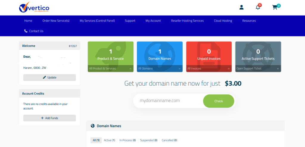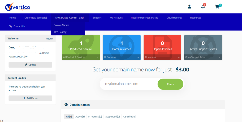 3. Click on the “My services (Control Panel)” to manage your services and access control panel.