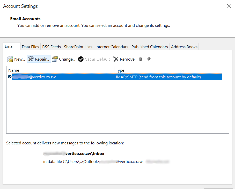 2. An Account Setting popup will appear, select the email again and click “Repair”.